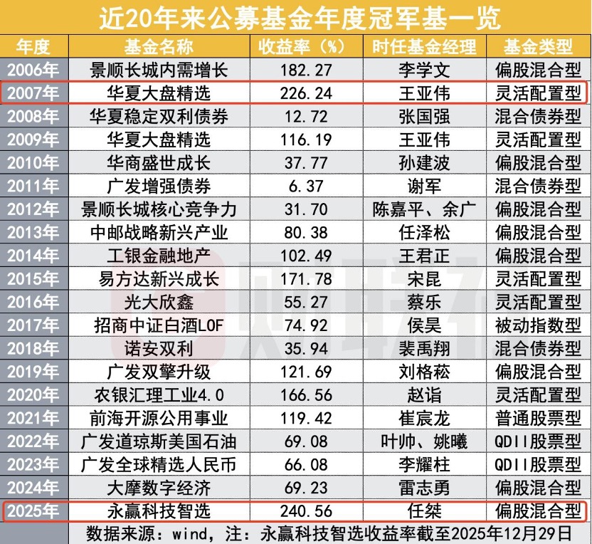 “去明星基金经理化”时代的冠军 永赢科技智选是永赢基金“智选”的一员,持仓方向主要在CPO,产品成立于2024年10月,同样是以1000万元发起式,随着净值攀升,规模也持续增加,尤其是今年三季度,永赢科技智选短短一个季度时间吸金超百亿,较年中11.66亿元增长近9倍。 永赢科技智选基金经理任桀这个名字,在今年上半年还名不见经传,自2025年8月27日起,永赢科技智选登上年内回报率冠军位置,坐稳第一至今,这位管理年限仅一年出头的年轻基金经理,因即将创造新的历史被业内熟知。 公开资料显示任桀的履历也相对简单,复旦大学理学学士、金融学硕士,7年证券相关从业经验。2018年加入永赢基金,历任TMT研究员、科技组组长,现任永赢基金权益投资部基金经理。 现在来看,公司角度并没有太多的个人包装。从开始管产品到成为冠军基金经理,任桀鲜少接受媒体采访或公开发言,只能在季报中可见他的观点。对板块看法之外,让投资者印象深刻的在于,永赢智选系列自今年一季度、二季度、中报以及三季度连续四个季报上提示风险。 智选系列均提示投资者,“不要仅仅因为热度高就跟风购买。若看好板块未来发展,可以考虑采用定投方式与行业共同成长,熨平短期波动,力争享受行业长期发展的红利。同时,也希望大家能够适当分散投资,从更理性、更长期的角度做好资产配置,不要把资金全部押注到单一产品。” 在公募高质量发展背景下,更多公司强调投研一体化,平台化运行模式,年轻经理可以借助公司整体投研能力快速成长,但是未经历牛熊周期的年轻基金经理创下收益率新纪录,在平台实力、个人努力之外,运气成分也在,未来能走多久,更是思考的话题。 近20年公募冠军今何在? 回顾过去20年公募基金冠军榜,冠军后浪推前浪,几乎没有常胜将军。 从收益率来看,能够翻倍基金并不容易,20年以来仅9个年份,包括2006年李学文管理的景顺长城内需增长、2007年和2009年王亚伟的华夏大盘精选、2014年王君正的工银金融地产、2015年宋昆的易方达新兴成长、2019年刘格菘的广发双擎升级、2020年赵诣的农银汇理工业4.0以及2021年崔宸龙的前海开源公用事业。此外就是今年的新冠军永赢科技智选。 从冠军基来看,也能看到市场大类资产的变换,比如2008年、2018年的债基当家。2022年、2033年连续两年的QDII基金称王。